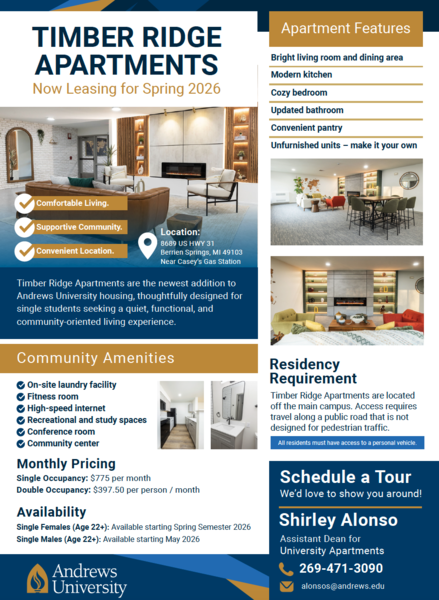 Timber Ridge Apartments are the newest addition to Andrews University housing, thoughtfully designed for single students seeking a quiet, functional and community-oriented living experience. Apartment Features ... read moreAnnual Seminary Book Sale, Feb. 3