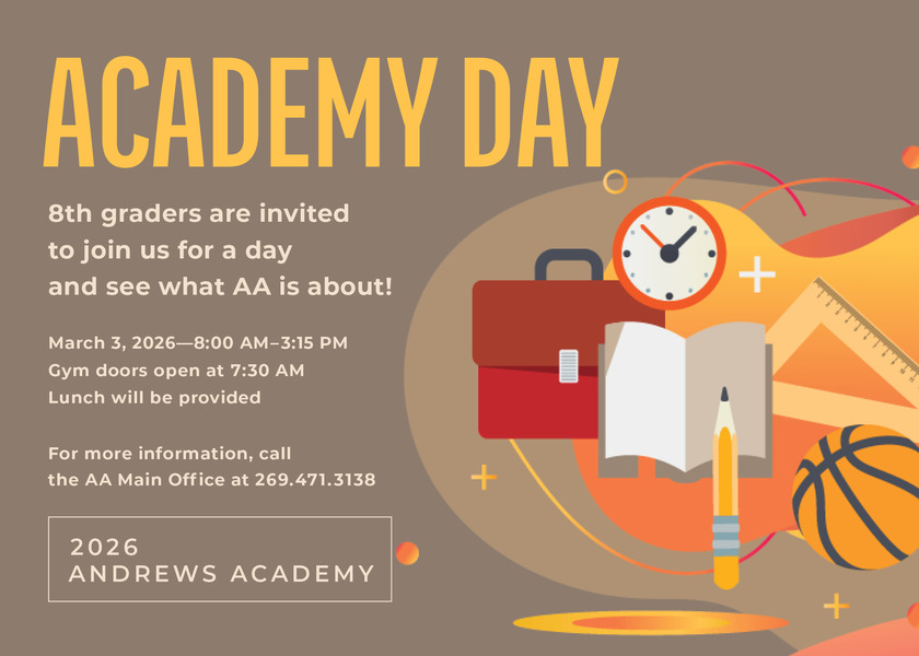 Eighth graders, please join us for Academy Day at Andrews Academy! Tuesday, March 3, 2026, from 8 a.m.–3:15 p.m. Gym doors open at 7:30 a.m. for check-in/registration. ... read more