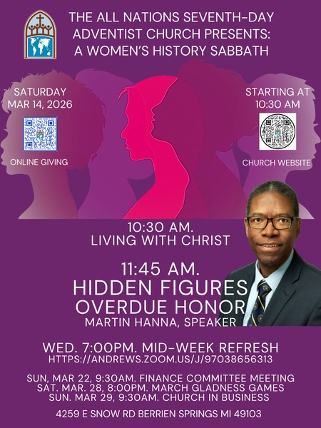 Join us for our worship experience at the All Nations Seventh-day Adventist Church this Saturday, March 14, at 11:45 a.m., as Martin Hanna presents "Hidden Figures: Overdue Honor." Adult and Children's Sabbath School begins at 10:30 a.m. We...