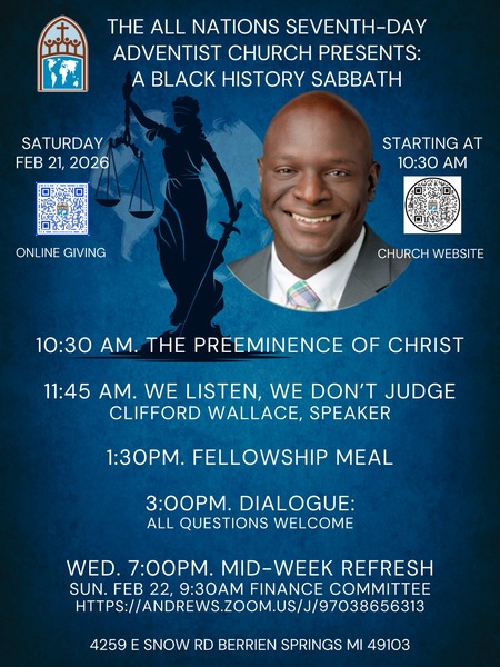 Join us for our Black History worship experience at the All Nations SDA Church this Saturday, February 21, at 11:45 am, as Clifford Wallace presents "We Listen, We Don't Judge." Adult and Children's Sabbath School begins at 10:30...